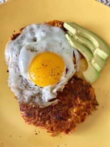 Use your mandolin or box grater, to shred about 4.5 ounces worth of sweet potato. Then, combine your grated potato with two egg whites, and a half teaspoon each of salt, pepper, garlic powder, and chili powder. I had about two ounces of leftover unseasoned mashed potatoes, so I added those in to bind the browns a bit more. If you don’t happen to have any mashed potatoes laying around, you can grate an additional ounce or two of potato. Once combined using a fork, portion into 2 or 3 good sized hash browns, and cook each side over medium heat for about four minutes, or until they are golden brown and crusty.